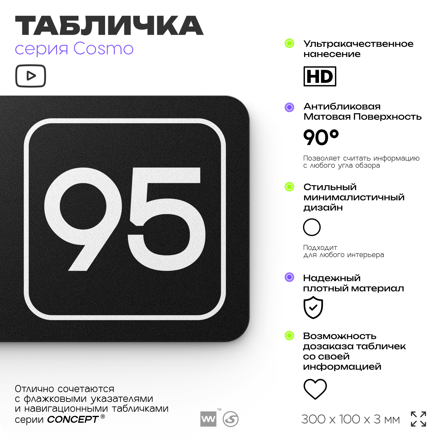 Табличка с номером помещения "Помещение №95", номер на дверь, 30 х 10 см, серия COSMO, черная, Айдентика Технолоджи