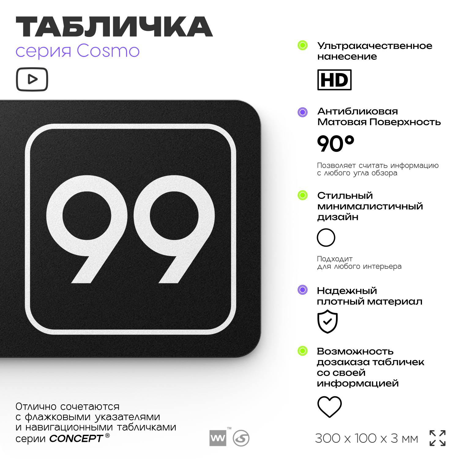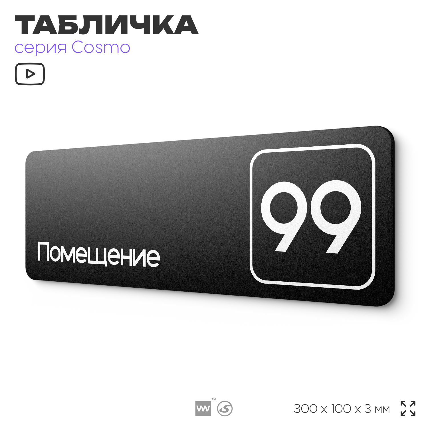 Табличка с номером помещения "Помещение №99", номер на дверь, 30 х 10 см, серия COSMO, черная, Айдентика Технолоджи